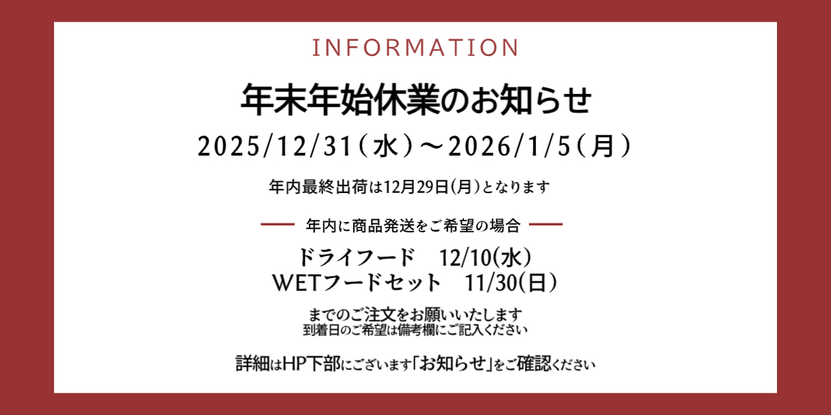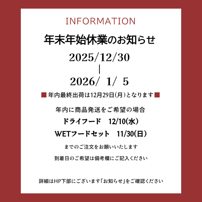 つきましては、年末年始にかけてドライフード・ウェットフードを