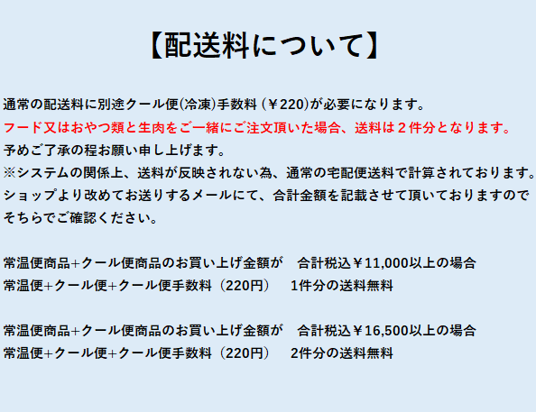 フード又はおやつ類と生肉をご一緒にご注文頂いた場合、送料は2件分となります。予めご了承の程お願い申し上げます。