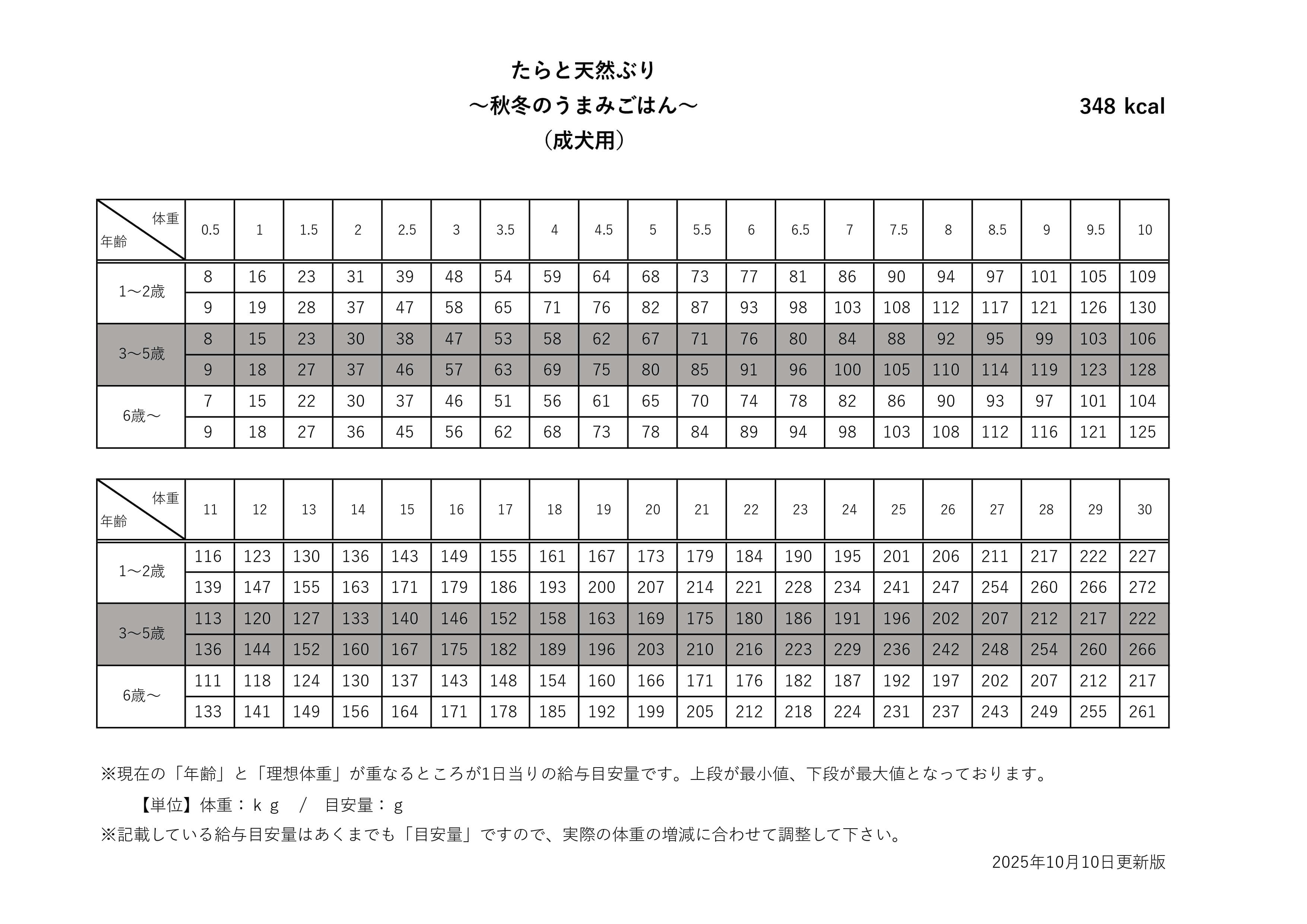 あくまでも“目安量”ですので、便の状態と実際の体重の増減に合わせて調整してください。