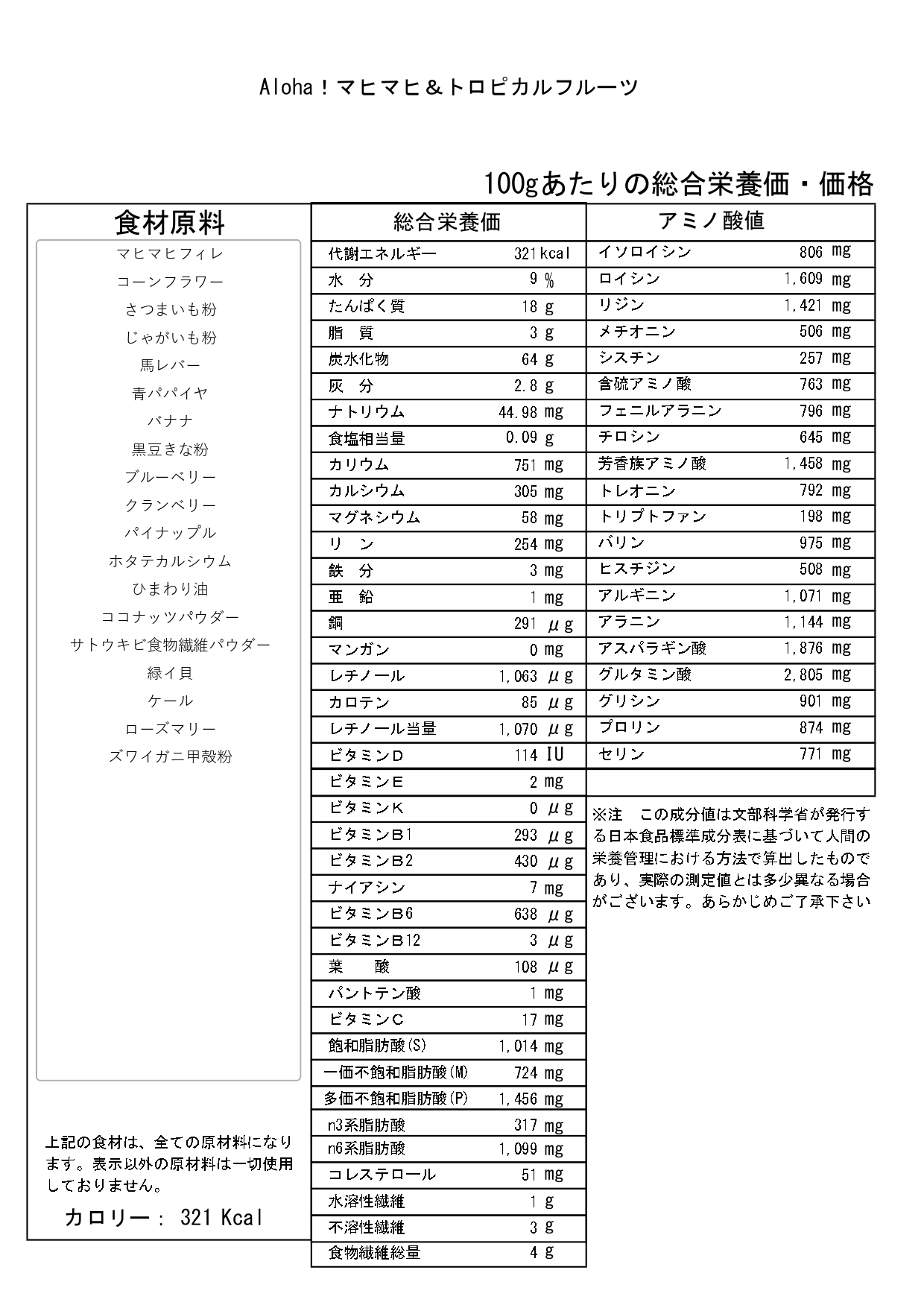 青パパイヤ、バナナ、パイナップル、ココナッツパウダー、ブルーベリー、クランベリーなど、